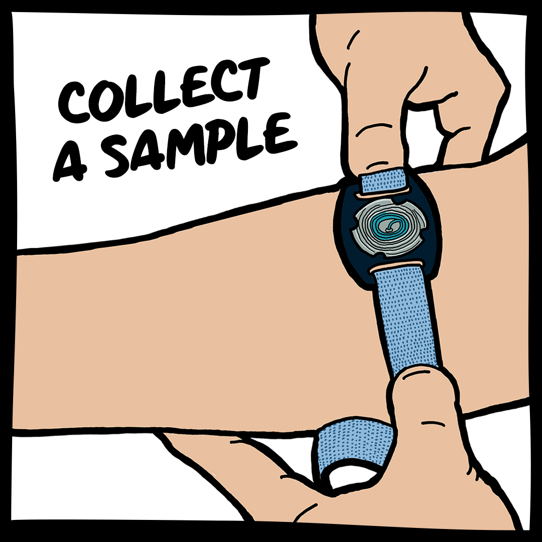 This disc is placed on top of the now-sweating spot, and collects the sweat sample into the tube. All we need is a few rings full before it’s ready to test.